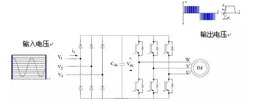 變頻器的基本構造如圖2所示,包括整流電路與逆變電路兩部分。整流電路為普通二極管與濾波電容構成的直流電壓輸出電路,逆變電路將直流電壓變換成脈寬調制的電壓波形(PWM電壓)。因此,變頻器驅動電機的電壓波形是脈寬變化的脈沖波形,而不是正弦波電壓波形。用脈沖電壓驅動電機就是導致電機容易損壞的根本原因。
